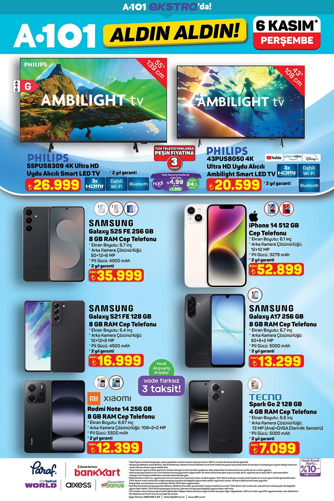 A101 marketlerde aktüel kataloğunda akıllı telefonlar, akıllı televizyonlar ve robot süpürgeler gibi popüler teknoloji ürünleri bulunuyor.