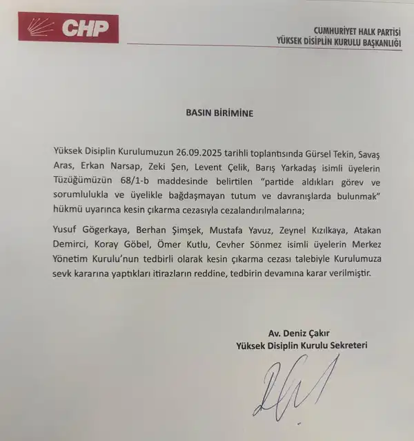 Son dakika gelişmesi… CHP Yüksek Disiplin Kurulu Partinin İstanbul İl başkanlığına kayyum olarak atanan Gürsel Tekin, Barış Yarkadaş, Savaş Aras, Erkan Narsap, Levent Çelik ve Zeki Şen’i partiden ihraç etti.